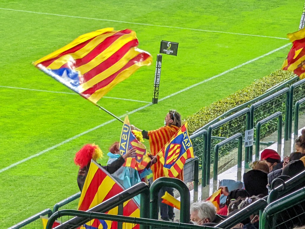 Il prossimo weekend, Treviso affronterà i milionarios del Tolone negli ottavi di finale della EPCR Challenge Cup. Questo avviene grazie alla vittoria per 17-7 ottenuta ai danni dei francesi del Perpignan, partita vinta a Treviso fra le mura amiche sotto un temporale scrosciante. Nel lasso di tempo che va dalle due e mezza alle quattro di pomeriggio a Treviso era caduta così tanta acqua dal cielo che sembrava impossibile drenare il campo in tempo. Nel riscaldamento, Ioane e Ratuva hanno approfittato delle pozze d’acqua per effettuare un po’ di prese al volo in slittamento, accompagnati dalle note di alcuni classici del rap anni 90 suonati dalle casse dello stadio. Entrambi ottimi ballerini, va detto. Nel frattempo, un ispiratissimo Padovani aveva notato qualcosa di plastica (probabilmente un bicchiere di birra) appoggiato forse di proposito in cima alla tenda delle birre e aveva deciso di provare a colpirlo con il pallone da trenta metri. Perché no, del resto i calci lunghi li doveva provare comunque. Al quinto tentativo ci è riuscito, scatenando i pochi tifosi già allo stadio, fra cui noi. Non l’avessimo mai fatto: si è fatto dare un paio di palloni, e ha deciso che il prossimo obbiettivo da colpire erano i seggiolini vicini a noi; per fortuna nessun ferito. I tifosi dell’USAP nel frattempo avevano iniziato ad arrivare, salendo dal bar del piano terra armati di parrucche, trombette, tamburi ed estreladas. Caldissimi, come sempre, invadevano lo stadio cantando e festeggiando come una marea giallorossa. Non sembrava esserci un clima particolarmente teso da nessuno dei due lati, non fosse che il clima pareva aver deciso che fosse fine Gennaio alle isole Svalbard.