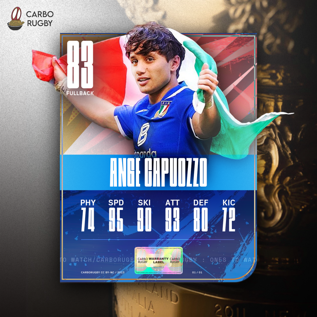 Non c’è appassionato o appassionata di rugby in Italia che non sappia chi è Ange Capuozzo. Terrore delle difese avversarie grazie alla sua rapidità, Ange è prima di tutto veloce nel decision making. Quando ha deciso dove puntarti, ti stai ancora allacciando le scarpe e te lo vedi sfrecciare a lato. Chiedete ai gallesi.